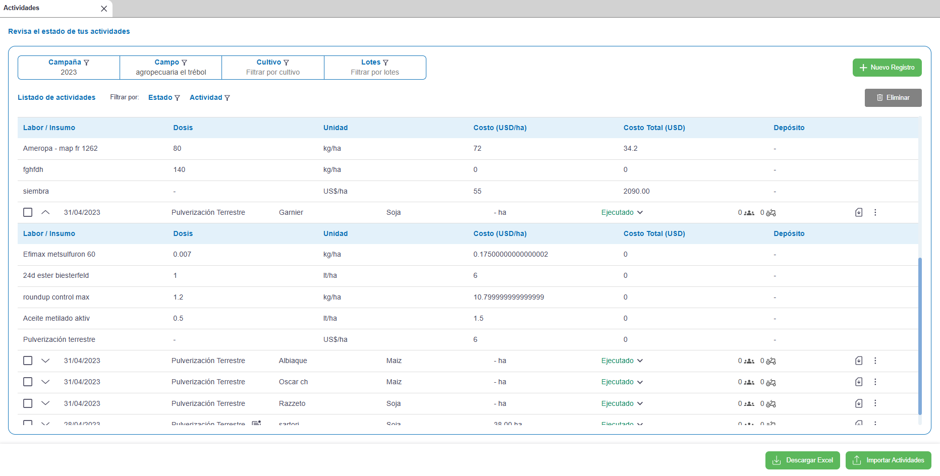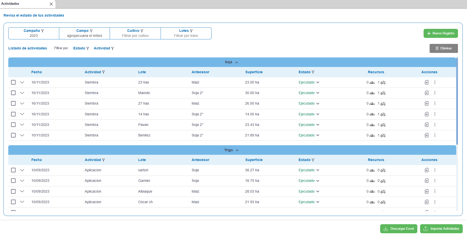 2) Allí verás todas las labores registradas en formato tabla. Para facilitar la búsqueda, podés utilizar los filtros disponibles: