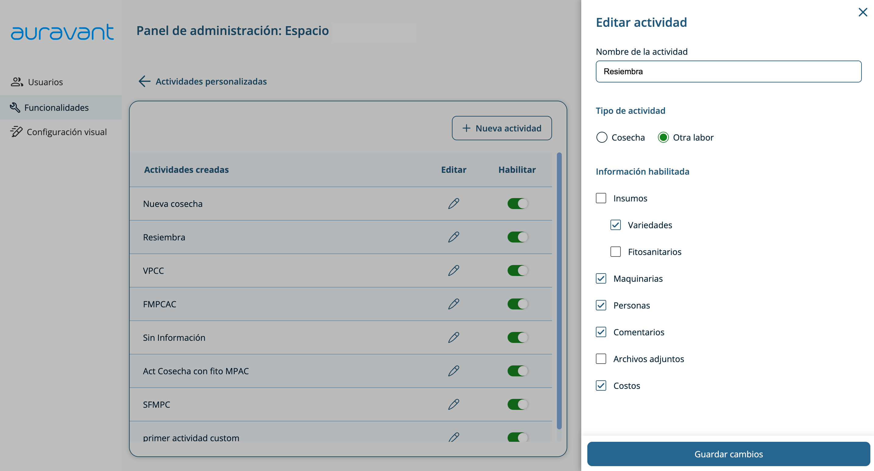 Desde el panel de administración de espacios, los usuarios administradores pueden acceder a la herramienta Actividades por espacio, que permite definir y gestionar labores personalizadas según las necesidades de cada espacio de trabajo, centralizando la información operativa y asegurando una gestión más ordenada y trazable.