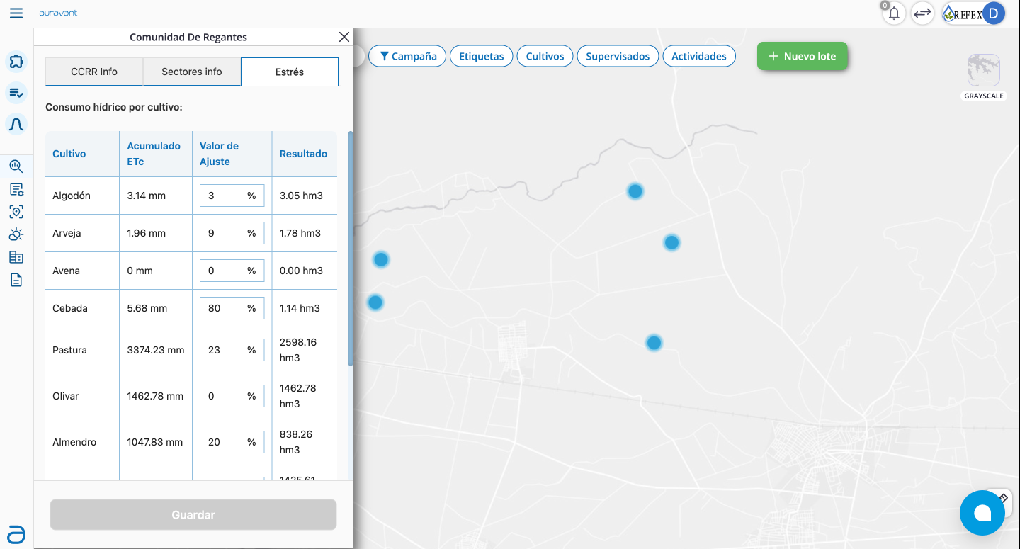 - Dotación anual: “Volumen total de agua que se puede utilizar durante la campaña, calculada automáticamente para todos los sectores de riego.