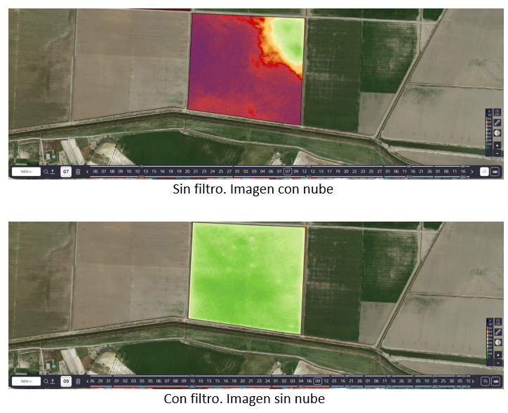 Es importante destacar que cuando tengas desactivado el filtro, observarás como referencia que la fecha de la imagen satelital con nubosidad se encuentra subrayada en blanco.