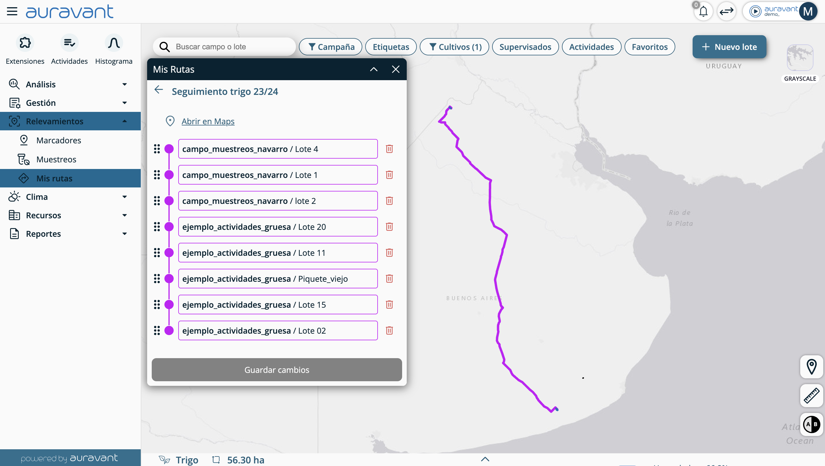 La herramienta Mis Rutas te permite planificar la mejor ruta para visitar tus lotes, optimizando tiempo y distancia. Es ideal para técnicos, asesores o productores que realizan recorridas frecuentes y quieren organizar su día de trabajo de manera más ágil y ordenada.